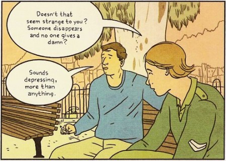 I’ve read both volumes (review of the first volume here: Tonoharu Vol.1), but I have the feeling that Dan is still isolated by language and cultural barriers from those around him. He may lead a less solitary existence, but I never have the impression that he connects with anybody. Now, he’s not lost in translation but his sexual liaison with a Japanese teacher hardly qualifies as a meaningful relationship. Actually, their meetings leave an impression of emptiness and through his contained style, the stylized drawing and the muted colors, Martinson shows that his character remains in his bubble and doesn’t really understand the Japanese or expat world around him. In the picture on the left, you can see that Dan is the only character in color, thus isolating him visually from the Japanese guests of the restaurant. Again in the scene of the train station below, he is sitting alone on a bench.